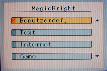 Sechs vorkonfigurierte Bildeinstellungen und eine benutzerdefinierte Einstellung lassen sich direkt durch drücken der Taste anwählen. Ändern kann man an den voreingestellten Modi Text, Internet, Game, Sport, Film und Optimalkontrast nichts. Nur die Einstellungen des benutzerdefinierten Bildmodus werden gespeichert und lassen sich dann sofort über die entsprechende Auswahl abrufen.