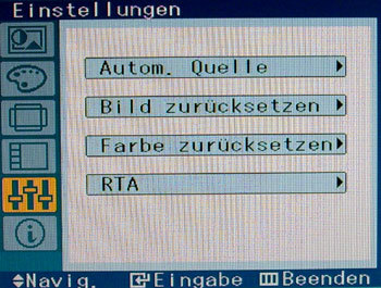 In diesem Menüpunkt können folgende Einstellungen gemacht werden: Automatische Wahl des Eingangssignals (Auto/Manuell), Bild zurücksetzen, Farbe zurücksetzen und RTA (ein/aus).