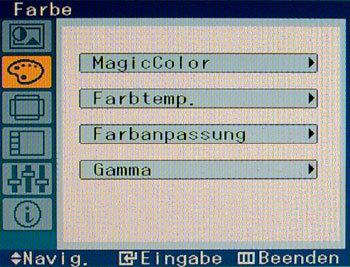 Im folgenden Bilder und Informationen zum Bildschirmmenü des Samsung 226BW. Die sichtbaren Einstellungen entsprechen denen nach unserer Kalibrierung.