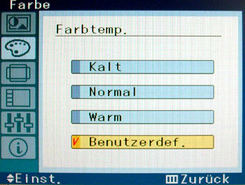 Hier kann die Farbtemperatur aus drei Voreinstellungen gewählt werden. Außerdem steht noch eine benutzerdefinierte Einstellung bereit. Ist diese ausgewählt, so können im Menü „Farbanpassung“ die einzelnen Farbwerte manuell angepasst werden.