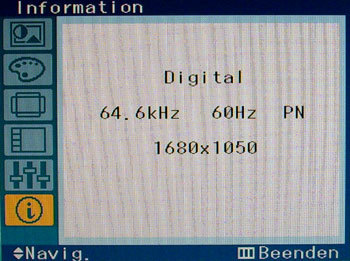 Hier werden die aktuell angezeigte Bildschirm-Auflösung, der benutzte Signaleingang sowie die vertikale und horizontale Bildfrequenz angezeigt.