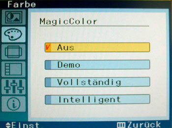 Die Funktion MagicColor überprüft die benutzerdefinierte Helligkeits- und Kontrasteinstellung und passt darauf basierend die Gammakurve an. Es stehen die Optionen Aus, Demo, Vollständig und Intelligent zur Auswahl.
