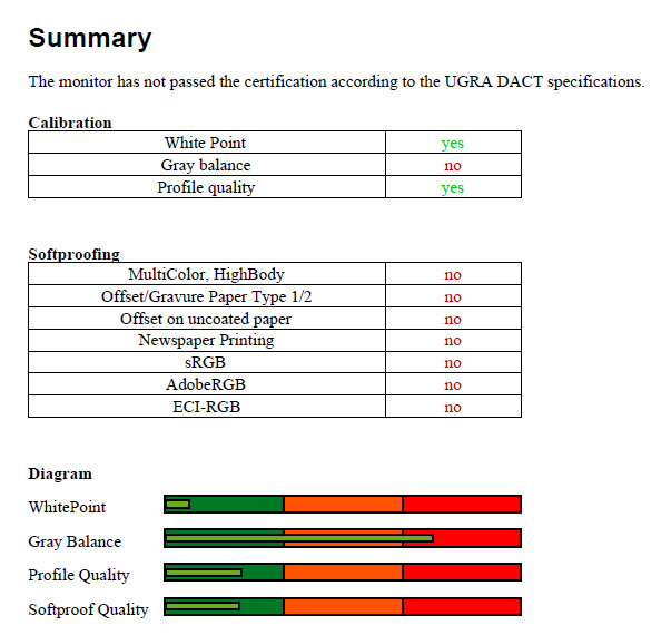 Abschließend haben wir den Samsung P2450H auf die Vorgaben der UGRA kalibriert (5800K, Gamma 1,8 und Helligkeit 120 cd/m2), um seine Tauglichkeit für die digitale Druckvorstufe/Softproof zu bestimmen. Im Rahmen einer Softwarekalibrierung besteht er die Zertifizierung nicht, da zu viele Tonwerte durch die Eingriffe in die Grafikkarten-LUT verworfen werden. Zu geringe Grauwerte von 86,7 Prozent verhindern eine UGRA-Zertifizierung, gefordert werden 95 Prozent.