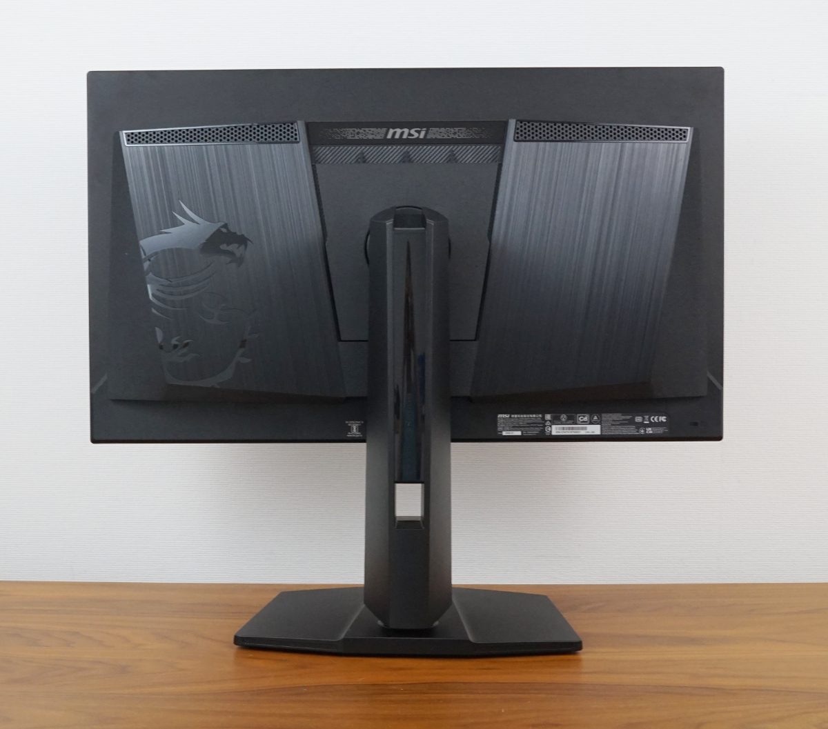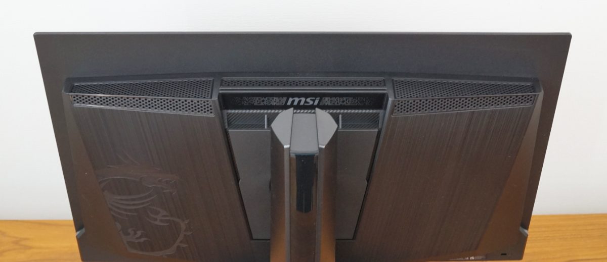Auf der Rückseite ist der Erker, in dem die Technik untergebracht ist, mit einer Art Metallrelief versehen, und auf einer Seite ziert der MSI-Drache in Hochglanzoptik die Rückseite. Auch der Standfuß ist von hinten hochglänzend.