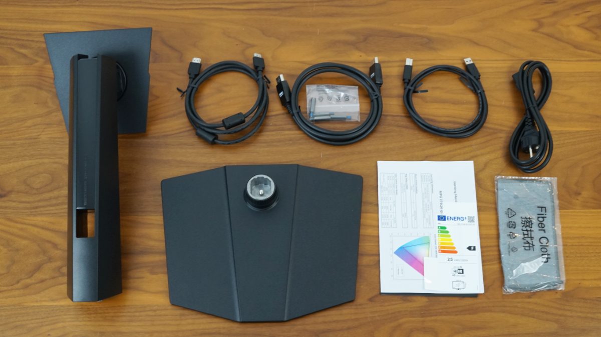 Neben dem Bildschirm selbst sind darin der Standfuß, der Monitorarm, Abstandsschrauben für eine Wandmontage sowie je ein Kabel für DisplayPort, HDMI, USB-B (Upstream) und Strom enthalten. Darüber hinaus liegen eine Schnellstartanleitung, ein Mikrofasertuch, ein Farbmessprotokoll, eine EU-Konformitätserklärung und ein Energielabel bei, das den Probanden in die Klasse F (SDR) bzw. G (HDR) einstuft.