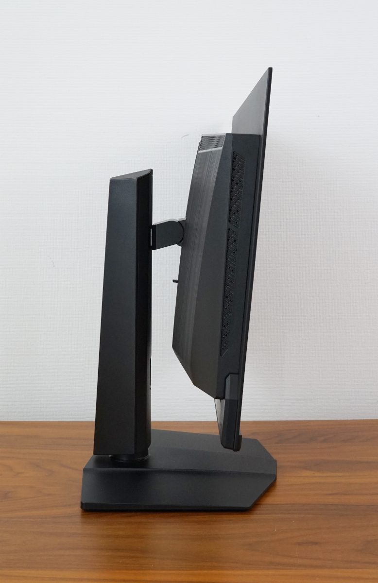 Der Bildschirm lässt sich mit geringem Kraftaufwand drehen. Die Drehung kann sowohl im als auch gegen den Uhrzeigersinn erfolgen. Zuvor muss der Monitor jedoch in die höchste Position gebracht und nach hinten geneigt werden, damit die Ecken des Displays nicht mit der Tischplatte kollidieren. Eine Höhenverstellung ist in dieser Position noch um 3,5 cm möglich, der Gehäuserahmen liegt in der tiefsten Position auf dem Standfuß auf.