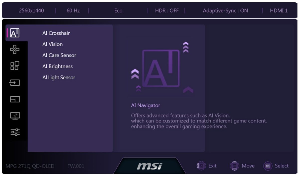 Positiv hervorzuheben ist, dass MSI das Einstellungsmenü überarbeitet und deutlich modernisiert hat. Die Benutzeroberfläche wirkt nun aufgeräumter und frei von unnötigen Modi. Die Hauptmenüs sind klarer strukturiert und mit verständlichen Beschreibungen versehen, während verschiedene Funktionen jetzt logischer in den passenden Kategorien untergebracht sind. Wird der Monitor per USB mit dem PC verbunden, kann das Menü alternativ über die Software Gaming Intelligence bequem mit der Maus gesteuert werden. Lediglich bei der deutschen Übersetzung einiger Optionen besteht noch Verbesserungsbedarf.