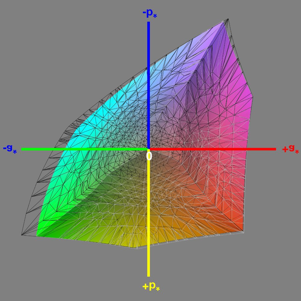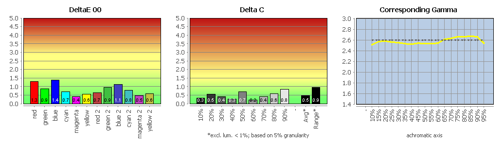 Bei der Graubalance (Delta-C-Average: 0,47; Delta-C-Range: 0,95) sind die Ergebnisse sehr gut. Die Farbwerte (Delta-E-2000-Average: 0,90) erreichen ebenfalls ein sehr gutes Ergebnis. Die Maximalabweichung liegt bei 1,98 Delta E 2000 (RGB: 63 127 255). Der Gammaverlauf beträgt im Schnitt 2,58 und ist wellenförmig.