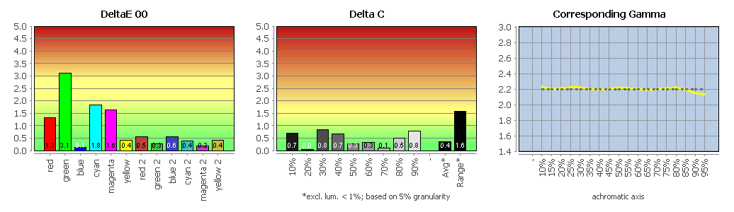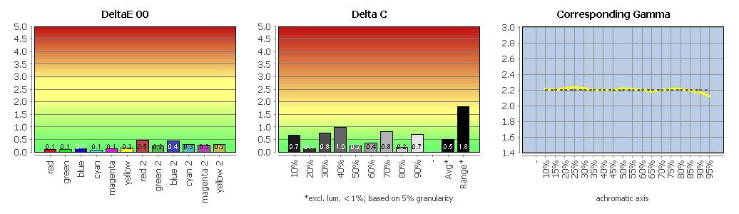 Die Graubalance (Delta-C-Average: 0,40; Delta-C-Range: 1,55) ist als gut bis sehr gut zu werten. Die Farbwerte sind sehr gut (Delta-E-2000-Average: 0,30). Der Gammawert beträgt im Schnitt 2,61. Die maximale Farbabweichung beläuft sich auf ein Delta-C-Average von 1,2 (RGB: 0 63 63).
