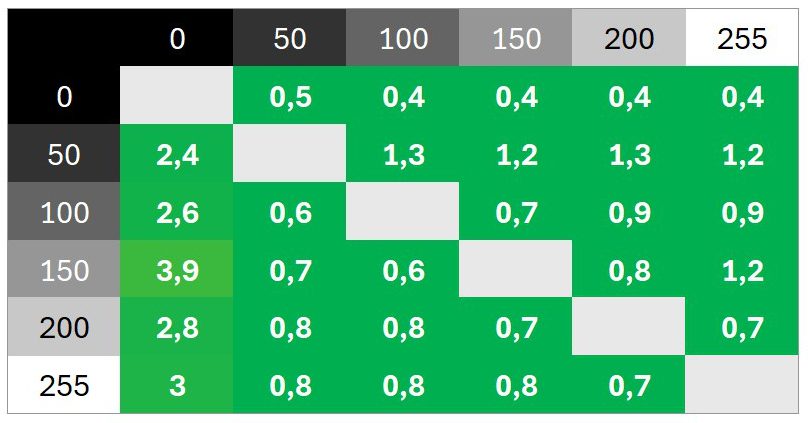 Wie nicht anders zu erwarten, sind die Reaktionszeiten bei einem OLED-Panel phänomenal schnell. Obwohl wir die 0,03 ms mit unserem Mess-Equipment nicht erreichen, gibt es an der Schnelligkeit nichts auszusetzen. Wir messen den Schwarz-Weiß-Wechsel (0–255) mit 0,4 ms und den schnellsten Grauwechsel ebenfalls mit 0,4 ms. Der Mittelwert über alle Messpunkte liegt bei 1,1 ms.