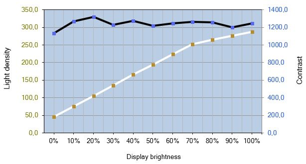 Der Kontrastverlauf ist etwas unruhiger, was bei höheren Werten aber auch an unserem Messgerät liegt, das „nur“ auf zwei Nachkommastellen genau misst. Im Durchschnitt liegt der Kontrast bei über 1200:1, wodurch die Herstellerangaben problemlos um über 20 % übertroffen werden konnten.