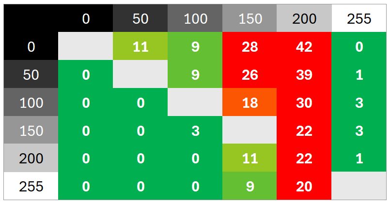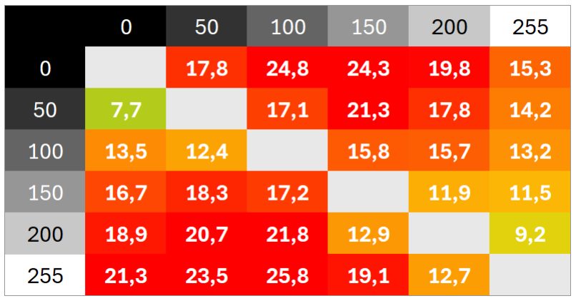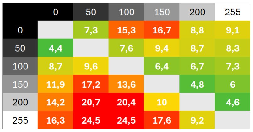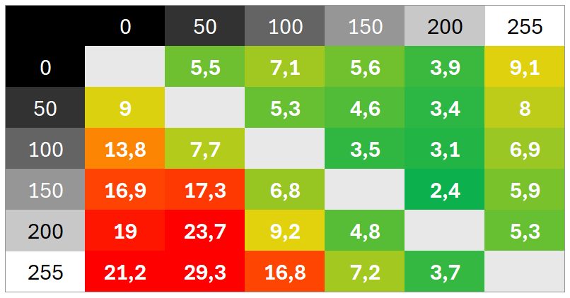 Überschwinger sind keine zu beobachten, die Abstimmung ist sehr neutral. Das Schaltzeiten-Diagramm zeigt unter anderem, wie sich verschiedene Helligkeitssprünge addieren und wie schnell der Monitor in der Werkseinstellung im besten Fall reagiert.