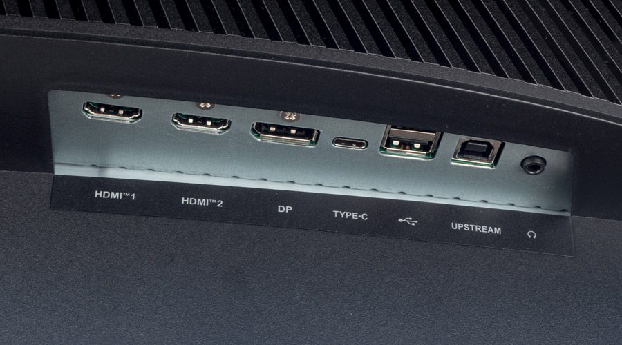 Das Anschluss-Panel weist eine horizontale Kabelführung auf und befindet sich von vorn betrachtet auf der linken Seite, unterhalb des Gehäuses auf der Rückseite. Ein Kabelwechsel gestaltet sich sehr mühsam, da dieser Bereich nur 16 cm von der Tischoberfläche entfernt ist. Zusätzlich hindert die enorme Panel-Breite zusätzlich das Erreichen der Steckplätze. Die Anschlussauswahl ist mit 1 x DisplayPort 1.4a, 2 x HDMI 2.1 und 1 x USB-C, das neben einem alternativen DisplayPort-Modus auch Laptops mit einem adäquaten Ladestrom von 90 Watt versorgen kann, sehr ordentlich.