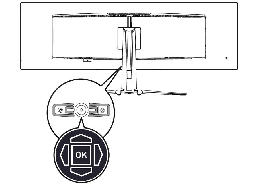 Die Bedienung des MSI MPG 491CQPDE QD-OLED erfolgt im Großen und Ganzen über den 5-Wege-Joystick (Navi-Key), der sich zentral hinter dem Monitor befindet. Aus der Front betrachtet befinden sich links daneben die Power-Taste und rechts daneben die Makro-Taste, die die OSD-Software-Anwendung startet.