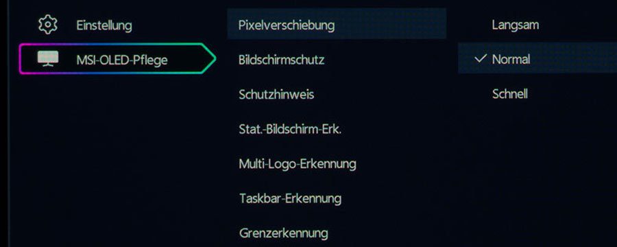 Auch die Kategorie „MSI-OLED-Pflege“ zeigt die gleichen erweiterten Einstellungen wie beim MSI MPG 321URXDE. Unter „Pixelverschiebung“ lässt sich die Geschwindigkeit des Intervalls festlegen, in dem die Pixel verschoben werden, um ein Einbrennen zu vermeiden.