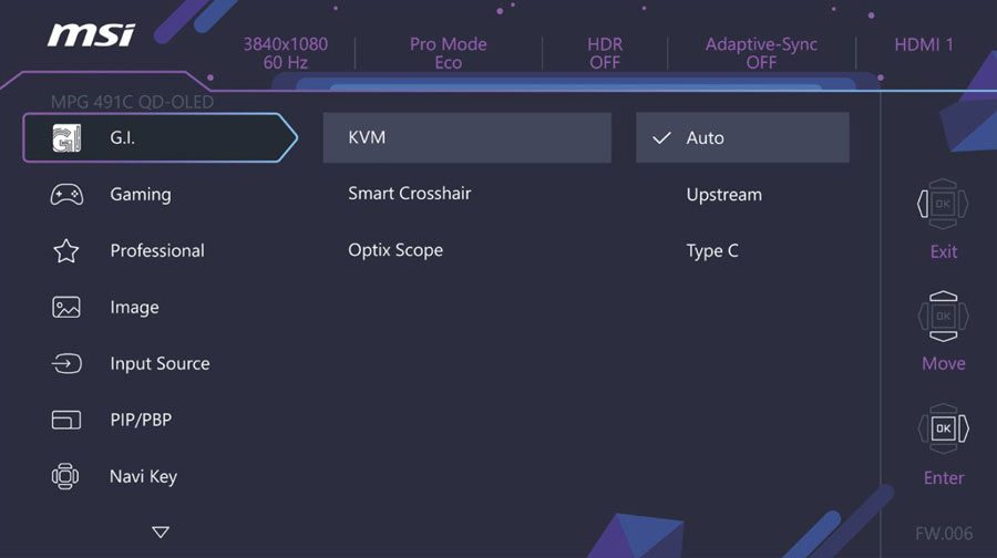 Das OSD-Menü zeigt exakt die gleichen Kategorien wie beim bereits getesteten MSI MPG 321URXDE. Lediglich die Einstellungen einiger spezifischer Optionen, etwa das Bildseitenverhältnis, weisen hier kleine Unterschiede auf.