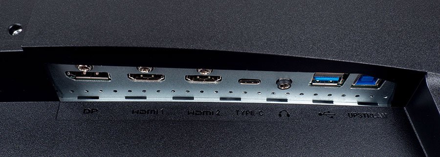 Die Anschlüsse befinden sich in einer Nische im unteren Bereich der Rückwand. Die senkrechte Kabelführung ist zwar dem Design zuträglich, erschwert aber natürlich einen Kabelwechsel – besonders, weil kein Pivot-Modus verfügbar ist. Glücklicherweise ist die Anzahl der verfügbaren Anschlüsse reichhaltig. Zu einem DisplayPort 1.2a gesellen sich zwei HDMI-2.0b-Schnittstellen. Zusätzlich verfügt das Display über einen USB-C-Port, der Videosignale und Strom liefern kann.