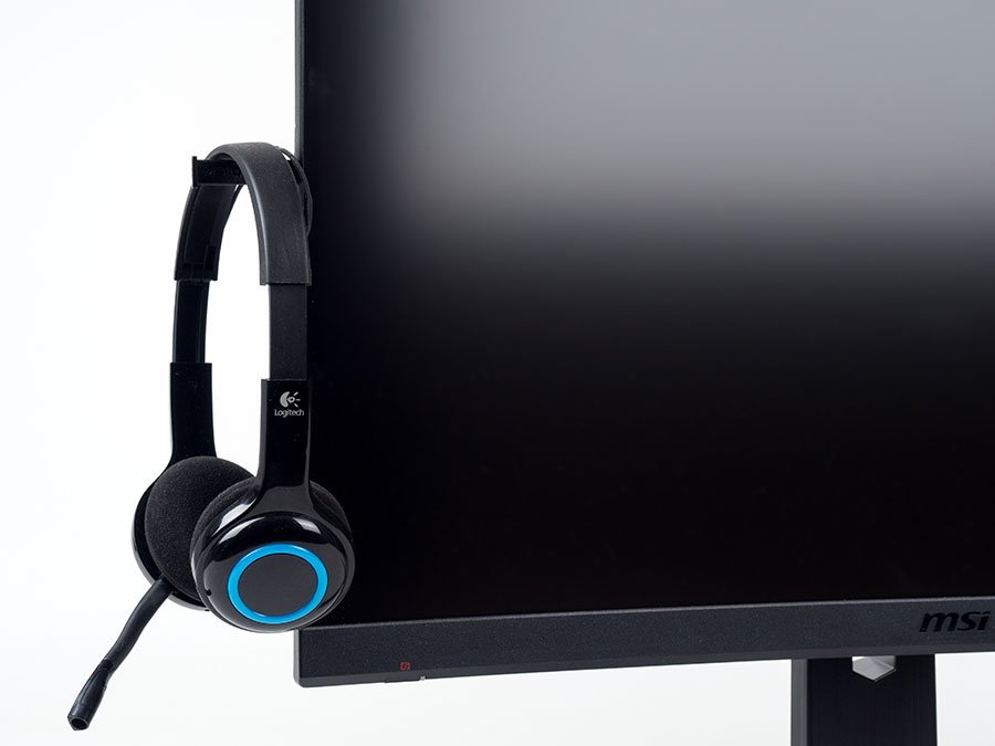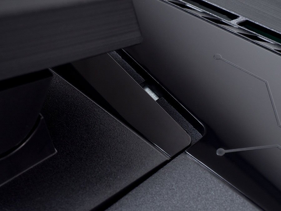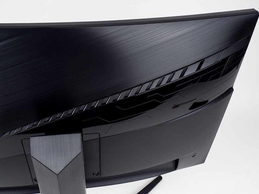 Die Tiefe des Displays beträgt an allen Außenseiten 15 mm. Auf der linken befindet sich ein Haken, der bei Bedarf ausgezogen werden kann und als Halterung für Kopfhörer dient. Die Rückwand verläuft von den Seiten zur Mitte in einem leichten Schwung und nimmt die Curved-Form aus der Front mit.