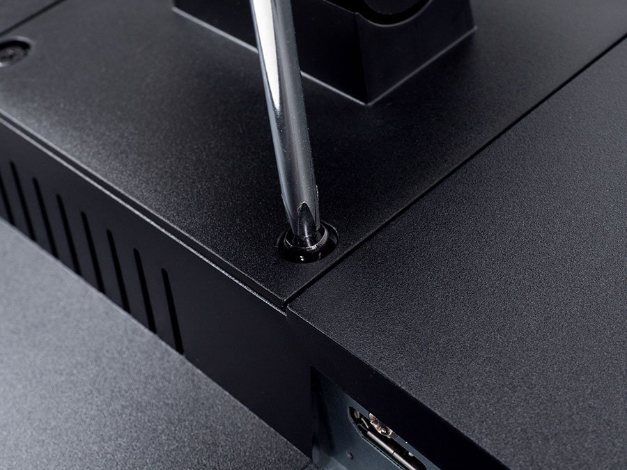 Die Halteplatte des Tragarms findet über die VESA-100-Vorbereitung auf der Rückseite des Displays Halt. Hierfür müssen die zwei Nasen der Halteplatte in die Vorrichtungen der VESA-Aufnahme eingeschoben werden. Durch die zwei beiliegenden Schrauben wird die Halteplatte letztendlich befestigt.