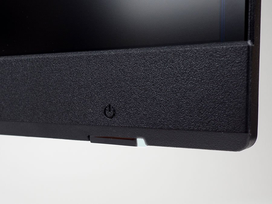 Auf der linken Unterseite des Rahmens befindet sich eine weitere Taste mit einer Betriebs-LED, die allerdings nicht aktiviert ist. Die Funktion wird zunächst im Handbuch nicht erklärt. Dort ist auf der Grafik zwar diese Taste zu sehen, doch wird sie mit keinem Wort erwähnt.