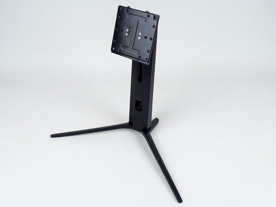 Auf eine Pivot-Funktion, mit der das Display von der Landscape- in die Porträtstellung gedreht werden kann, oder auf eine Möglichkeit der seitlichen Drehung muss man beim MSI Optix MAG272CQR leider verzichten. Der Monitorarm verfügt im unteren Bereich über ein Fenster, durch das die Kabel durchgeführt werden können. Ganz unten ist der Monitorarm mit der Basis verbunden. Sie besteht komplett aus Aluminium und verfügt über zwei Ausleger, die in einem großen Winkel zueinander stehen, um einen seitlichen Halt zu gewähren. Auf der Rückseite sorgen zwei kleine Stumpfe für den Halt nach hinten. Das gesamte Konstrukt ist hervorragend ausbalanciert und verträgt auch gröbere Stöße, ohne aus dem Gleichgewicht zu kommen. Unterhalb der Basis sorgen kleine Gummifüßchen dafür, dass der Monitor nicht auf dem Untergrund umherrutscht.