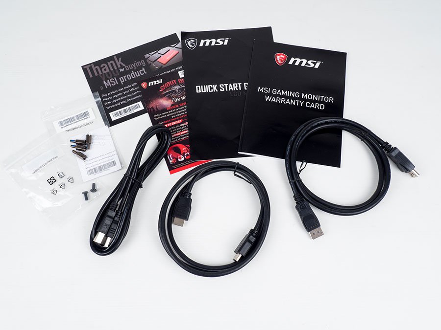 Den Inhalt erreicht man über die schmale Öffnung an der Oberseite. Hierfür muss selbiger komplett aus dem Karton gezogen werden und ist zur Erleichterung mit einer Kunststoffbanderole umgeben. Das Zubehör und die Bauteile sind auf mehrere Fächer verteilt. Vorhanden sind DisplayPort-, HDMI- und USB-3.0-Kabel. Um das Display an alternativen Halterungen anbringen zu können, sind noch vier Distanzschrauben vorhanden. Als Papierbeilage finden wir einen Quick-Start-Guide und ein Heft mit Garantiebedingungen, zusätzlich eine Karte mit Aufforderung zur Produktregistrierung und eine Gewinnspielkarte. Handbuch, Treiber und Farbprofil müssen von der Produkt-Website heruntergeladen werden.