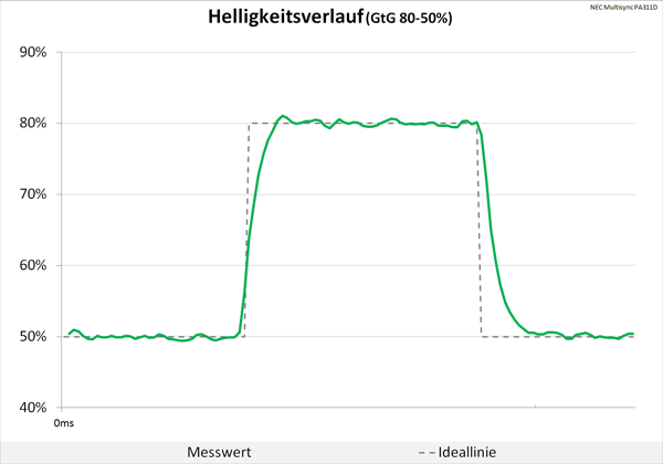 Der professionelle Grafikmonitor von NEC bietet keine umschaltbare Overdrive-Einstellung. In der Werkseinstellung werden dennoch zufriedenstellende Reaktionszeiten erreicht. Die halbe mittlere Bildwechselzeit liegt bei 8,8 ms. Auch der Input-Lag von 11,6 ms ist für einen 60-Hz-Monitor ordentlich. Die Latenz ermitteln wir demnach insgesamt mit 20,4 ms.