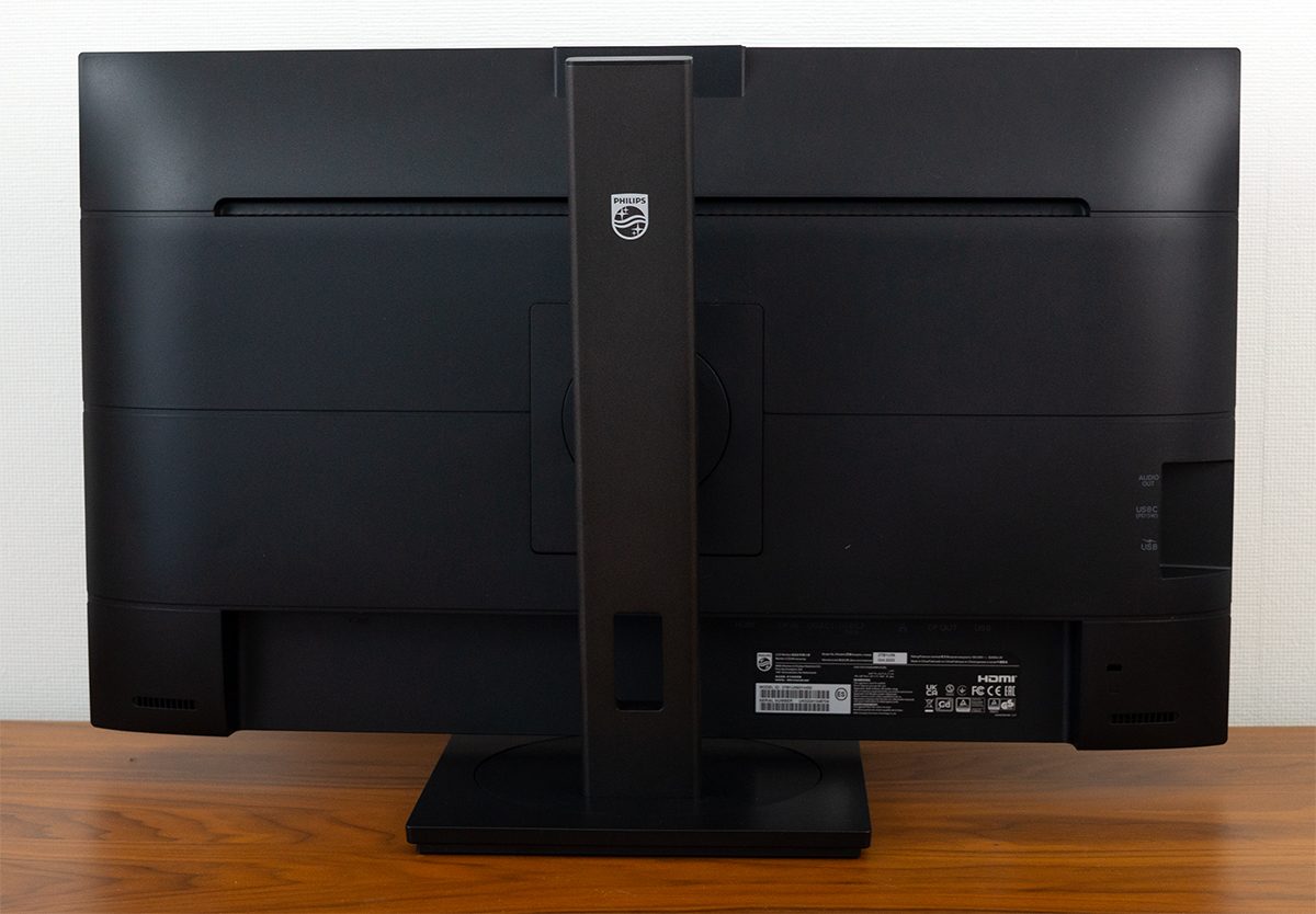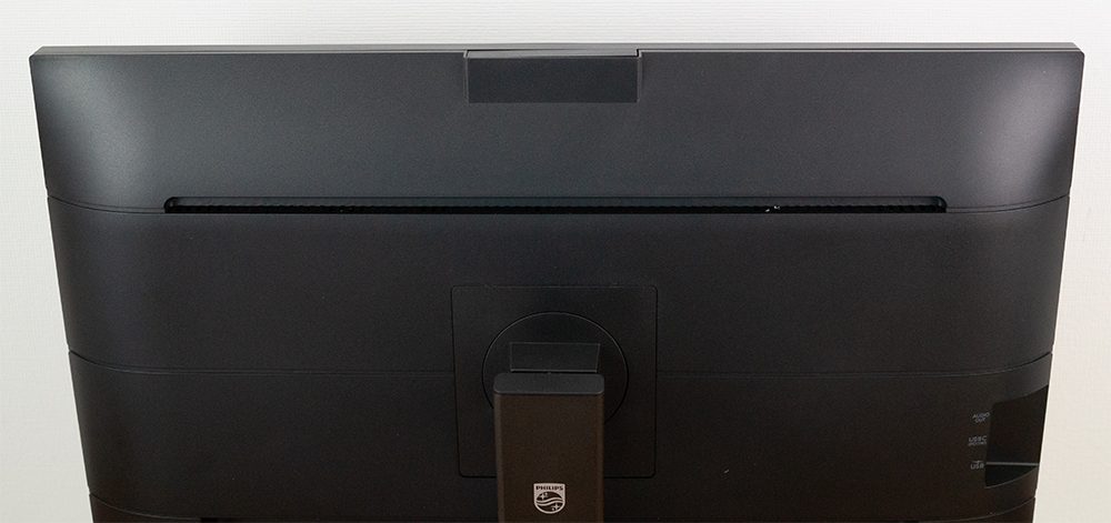 Beim Philips 27B1U5601H ist das Netzteil in das Gehäuse integriert und besitzt einen eigenständigen Netzschalter, wodurch das Gerät komplett vom Stromnetz getrennt werden kann. Lüftungsschlitze sind auf der Rückseite, unterhalb des Webcam-Moduls zu finden. Eine Erwärmung auf der Rückseite ist aber selbst nach einigen Stunden Betrieb nicht auszumachen.