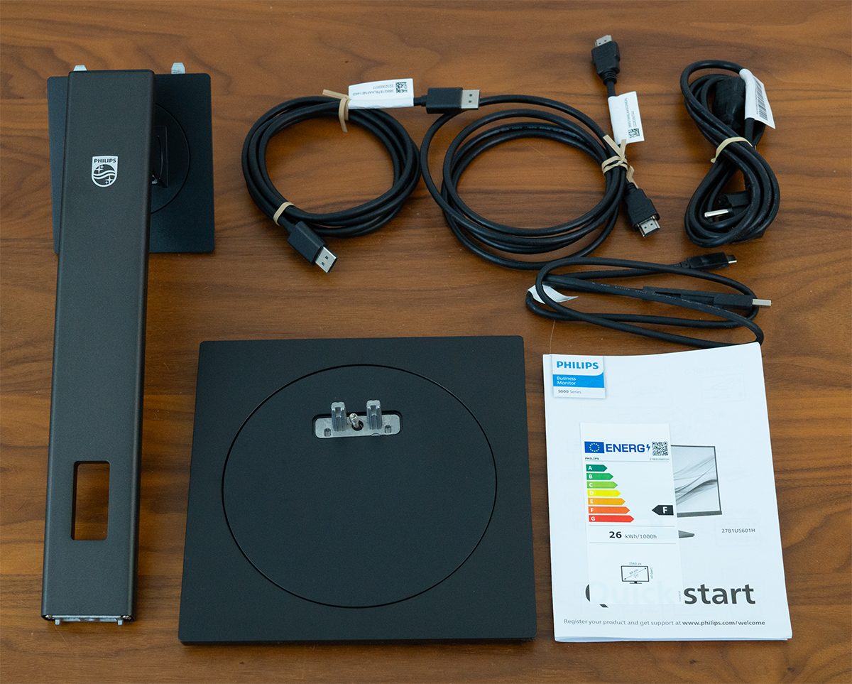 Der Philips 27B1U5601H wird in einem Karton mit den Maßen 72 x 47 x 19,5 cm (B x H x T) geliefert. Neben dem Monitor selbst sind der Standfuß, der Monitorarm sowie je ein Kabel für DisplayPort, HDMI, USB-C und Strom enthalten. Außerdem liegen eine Broschüre mit Sicherheitshinweisen, eine Schnellstartanleitung und ein Energielabel der Klasse F bei.