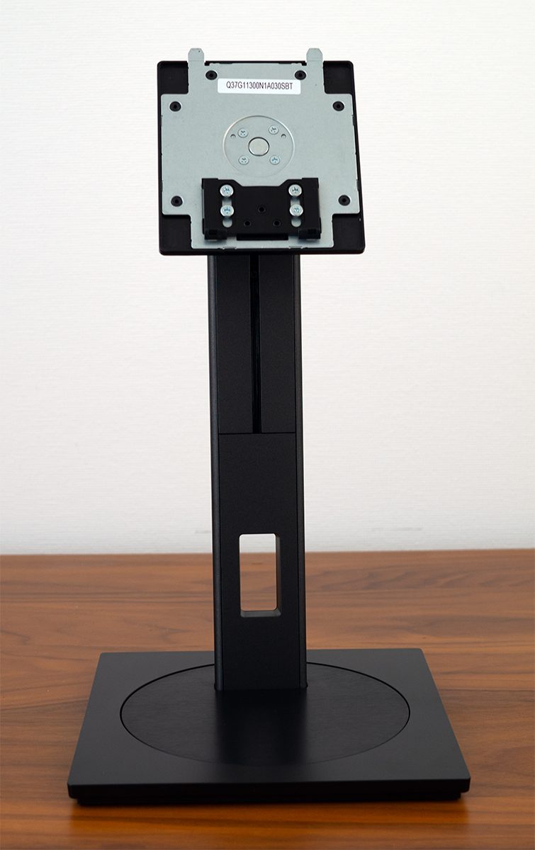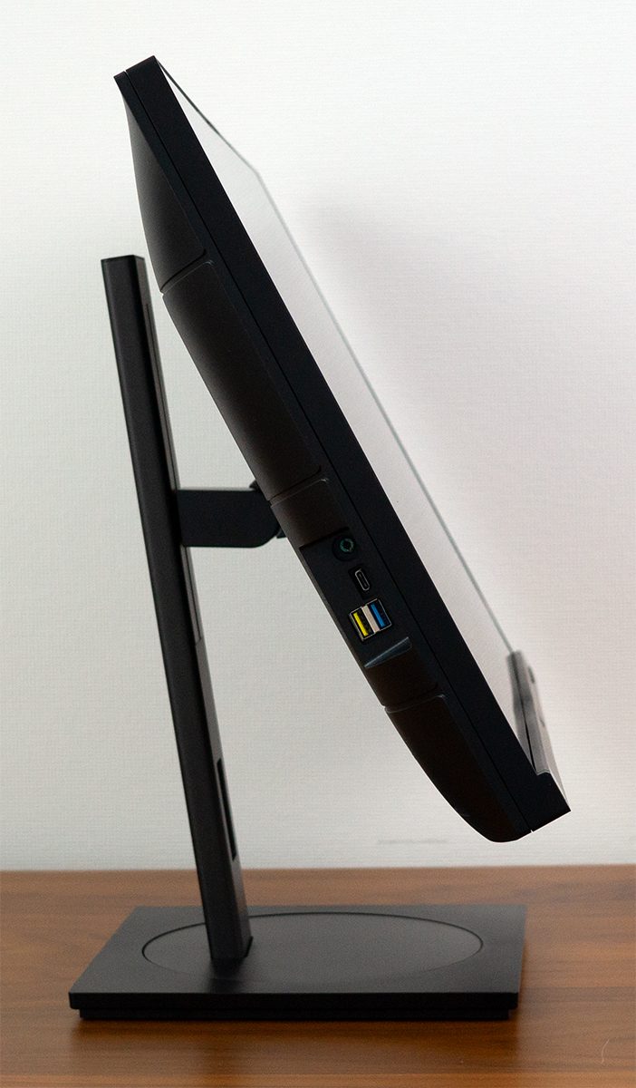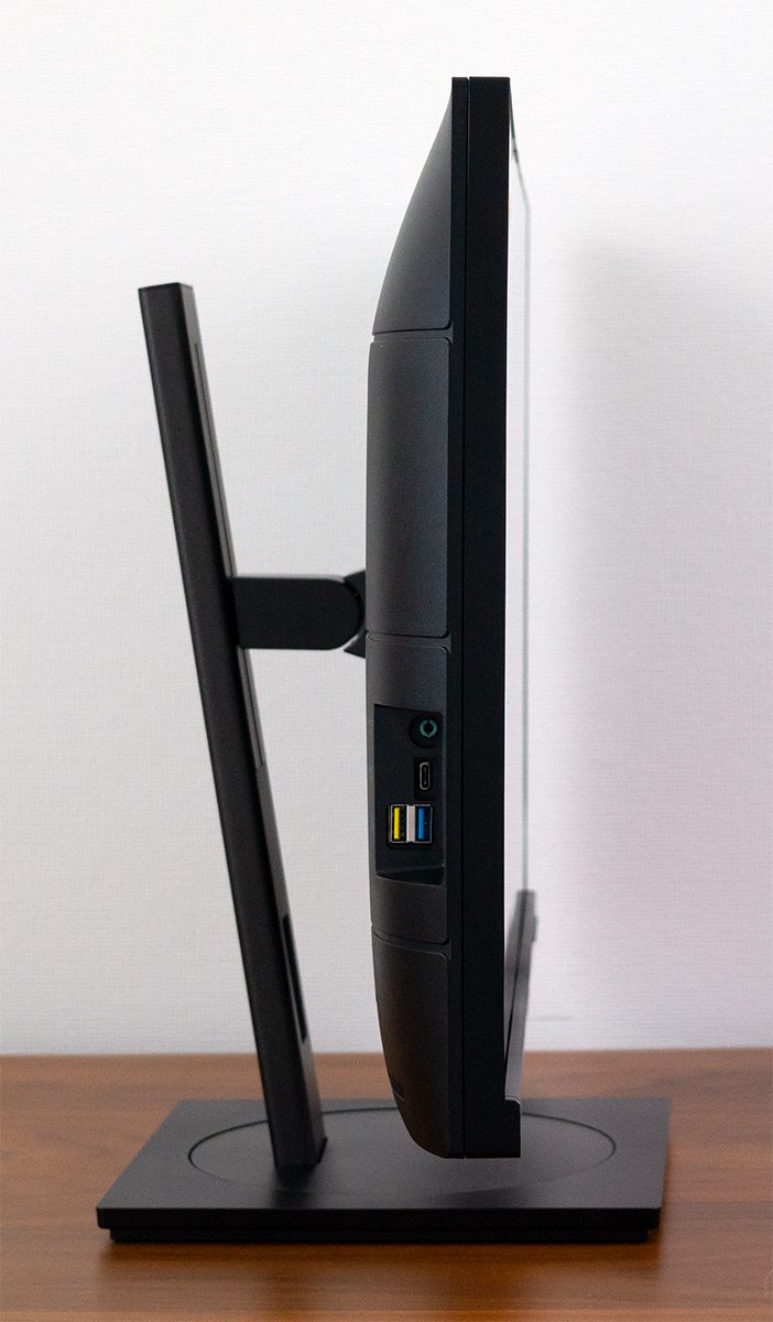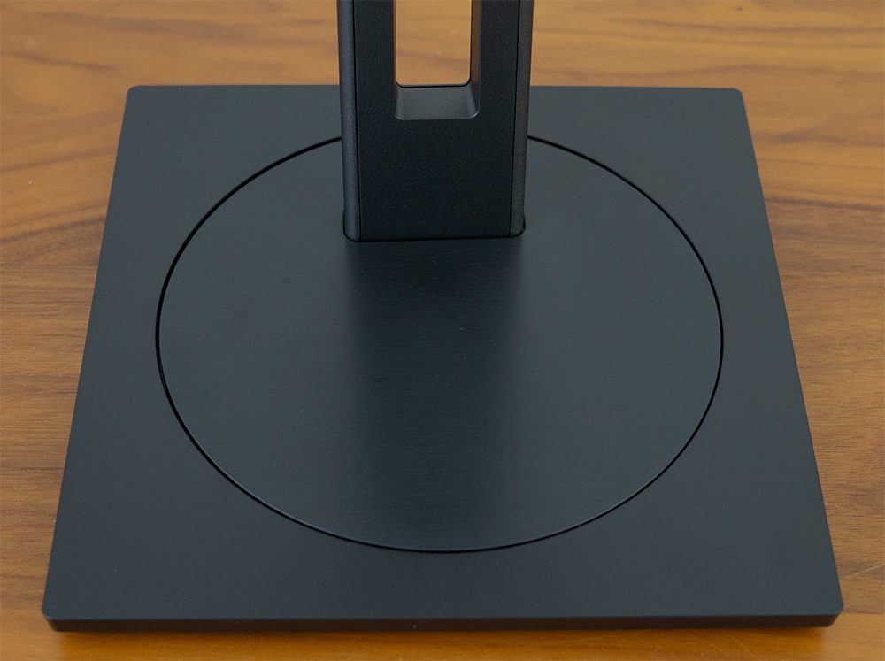 Ergonomisch bietet die Standfußkonstruktion alle Funktionen wie eine 360-Grad-Drehung um die eigene Achse und eine Höhenverstellung über einen Schlitten. Zusätzlich kann die Neigung des Bildschirms eingestellt und über ein Drehgelenk um 90 Grad in den Porträtmodus gedreht werden. Damit die Kabel nicht planlos herunterhängen, können sie durch die Öffnung des Standfußes geführt werden.