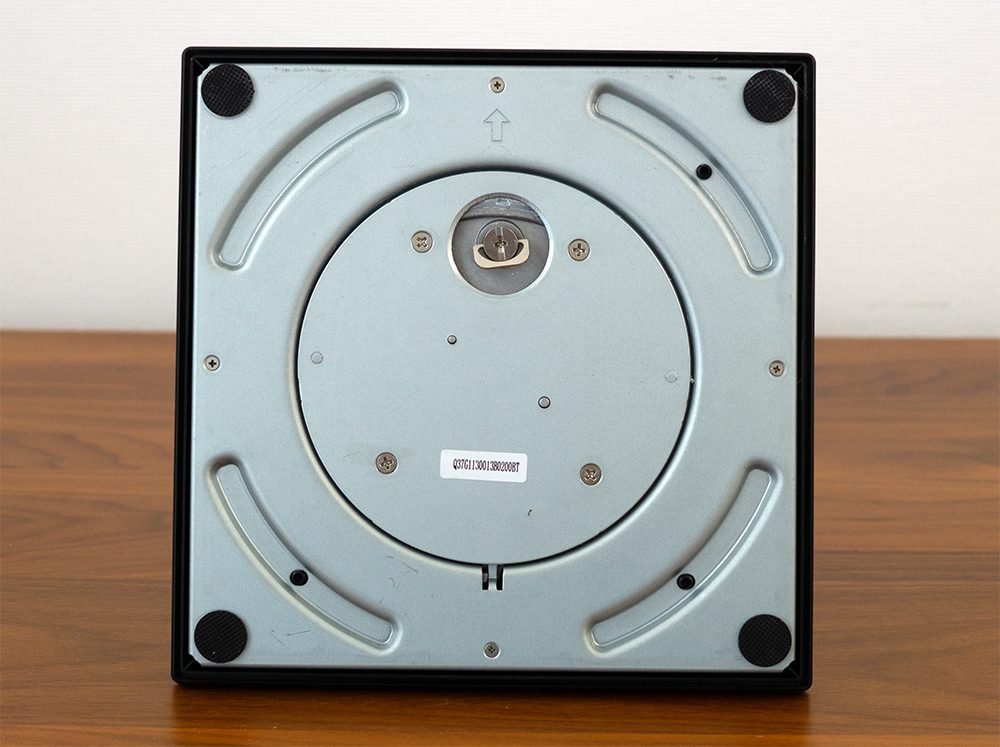 Anschließend wird der Standfuß auf der Rückseite des Displays in die dafür vorgesehene Öffnung eingeführt und nach unten gedrückt. Dort sind auch die vier Schrauben sichtbar, mit denen alternative VESA-100-Halterungen befestigt werden können. Um den Standfuß wieder zu entfernen, wird einfach der mittige Schalter nach oben gedrückt und die Arretierung gelöst.