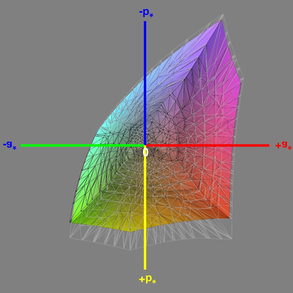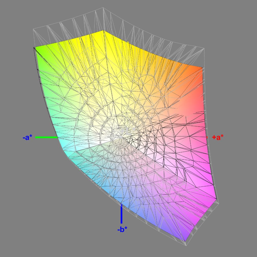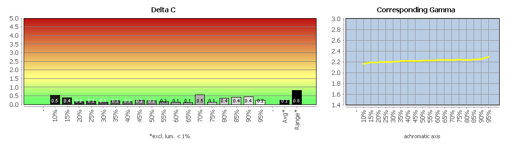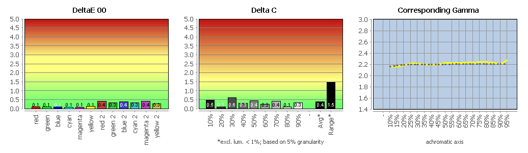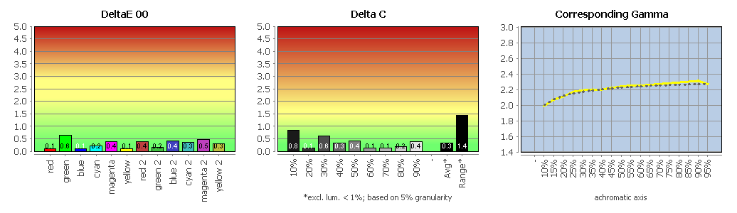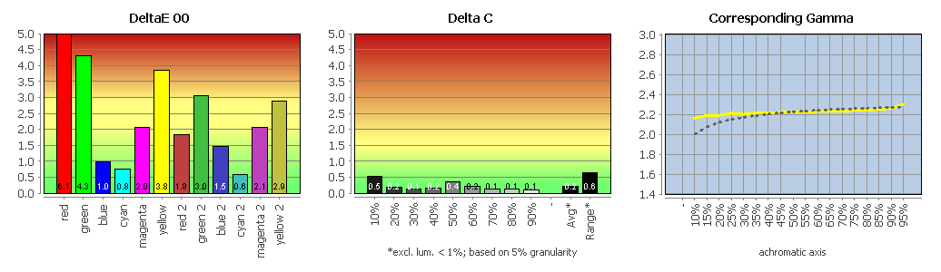 Bei der Graubalance (Delta-C-Average: 0,20; Delta-C-Range: 0,64) sind die Ergebnisse ausgezeichnet und bei den Farbwerten (Delta-E-2000-Average: 1,98) gut. Die Maximalabweichung liegt allerdings bei hohen 6,14 Delta E 2000 (RGB: 255 0 0). Der Gammaverlauf beträgt im Schnitt 2,22 und ist nicht normgerecht.
