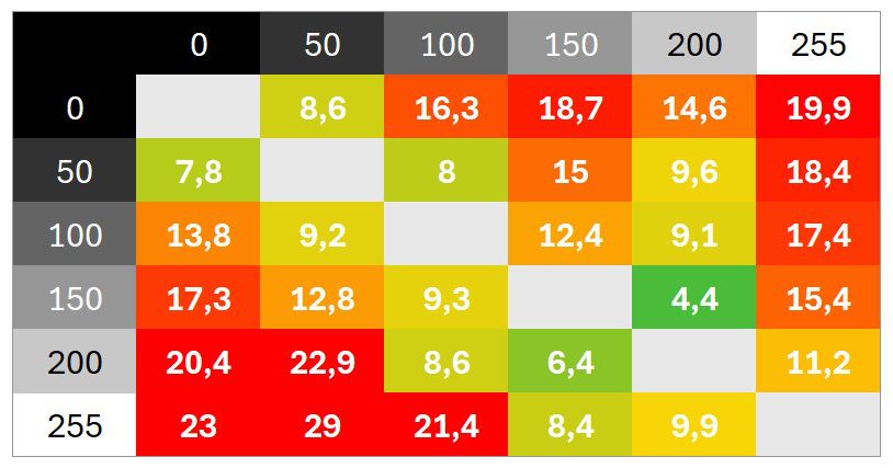 In der Einstellung „Schneller“ messen wir den Schwarz-Weiß-Wechsel (0–255) mit 19,9 ms und den schnellsten Grauwechsel mit 4,4 ms. Der Mittelwert über alle Messpunkte liegt bei 14 ms. Insgesamt können die Messwerte als noch knapp zufriedenstellend bezeichnet werden.