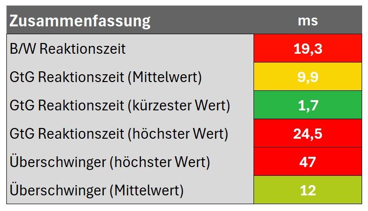 In der höchsten Overdrive-Stufe „Am schnellsten“ messen wir den Schwarz-Weiß-Wechsel (0–255) mit 19,3 ms nur leicht verbessert und den schnellsten Grauwechsel mit 1,7 ms. Der Mittelwert über alle Messpunkte liegt bei 9,9 ms. Insgesamt verbessern sich die Messwerte, aber nicht alle. Damit wird die vom Hersteller versprochene Reaktionszeit von 4 ms erreicht.