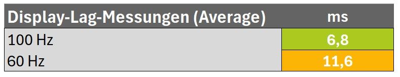 Wir haben die Latenzzeit in der nativen Auflösung (2560 × 1440) bei 60 Hz und 100 Hz am DisplayPort gemessen.