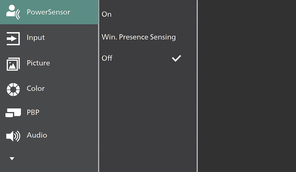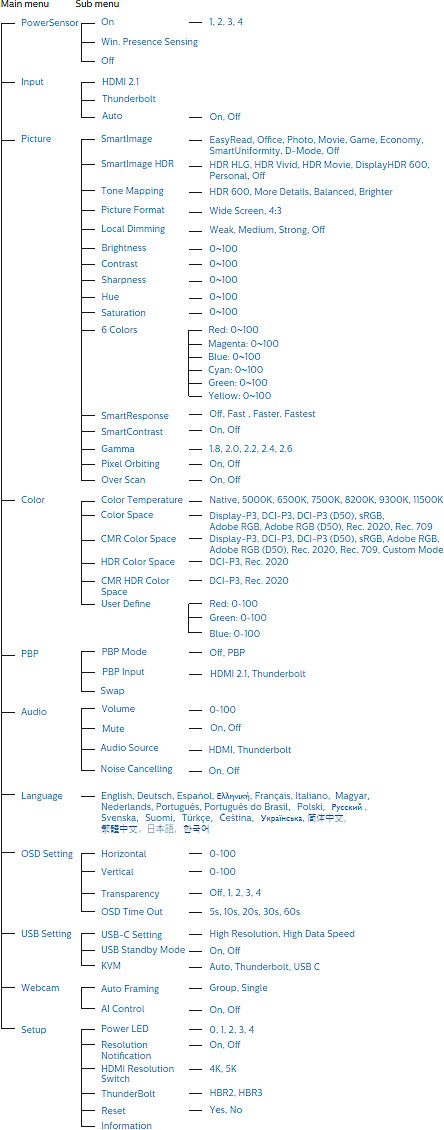 Dem Komfort – und zugleich der Energieeffizienz – dient zudem ein Infrarotsensor, der sowohl die Umgebungshelligkeit misst als auch die Anwesenheit des Nutzers am Arbeitsplatz erkennt. Die letzte Abbildung zeigt die vollständige Menüstruktur des OSDs im Überblick.