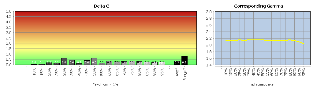 Im Adobe-RGB-Modus verläuft das Gamma wie erwartet linear, liegt in den relevanten Helligkeitsbereichen aber auch in seiner absoluten Höhe sehr genau dort, wo es sein soll. Die Graubalance fällt hier nochmals etwas besser aus (Delta-C-Average: 0,22; Delta-C-Range: 0,63).