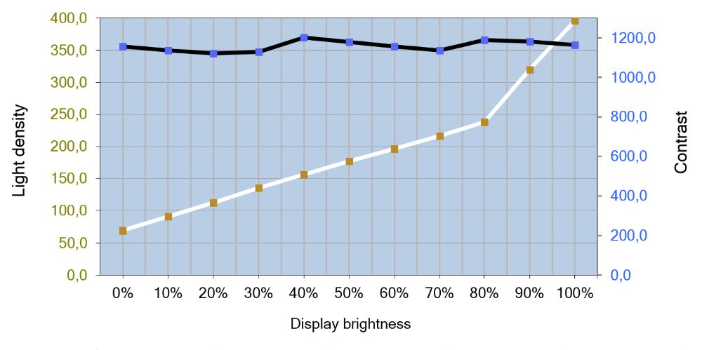 Das Kontrastverhältnis des IPS-Panels wird vom Hersteller mit 1000:1 angegeben. Nach unseren Messungen beläuft sich der maximale Kontrast bei 40 % Helligkeit auf 1202:1 und im Durchschnitt auf sehr gute 1159:1. Nach der Kalibrierung liegt er bei 1096:1.