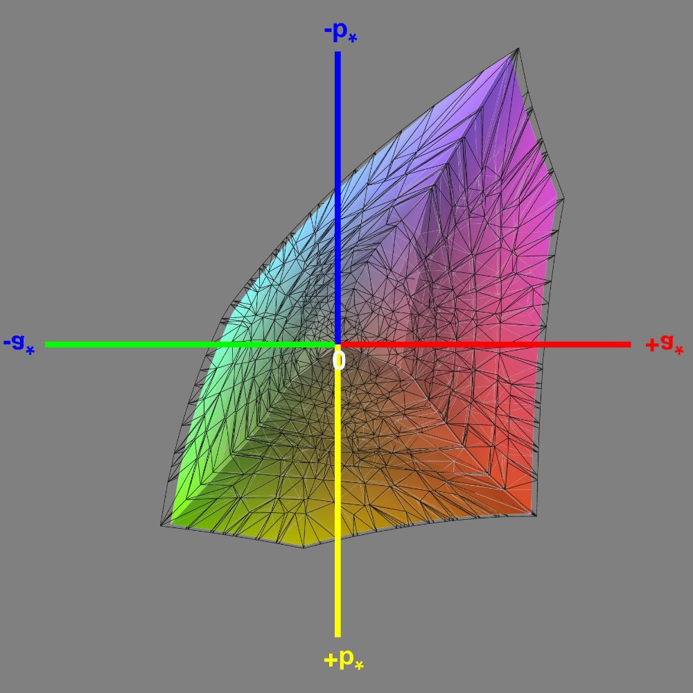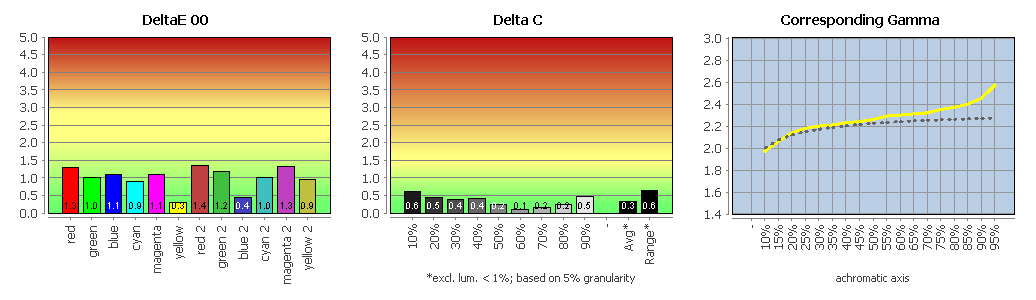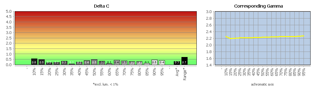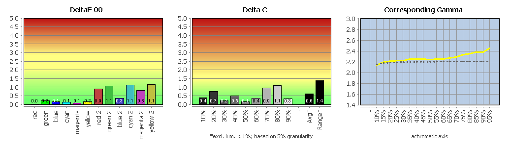 Bei der Graubalance (Delta-C-Average: 0,34; Delta-C-Range: 0,63) sind die Ergebnisse ausgezeichnet und bei den Farbwerten (Delta-E-2000-Average: 0,95) ebenfalls sehr gut. Die Maximalabweichung liegt lediglich bei 1,68 Delta E 2000 (RGB: 0 127 63). Der Gammaverlauf beträgt im Schnitt 2,27 und verläuft ab 64 % Helligkeit nicht normgerecht.