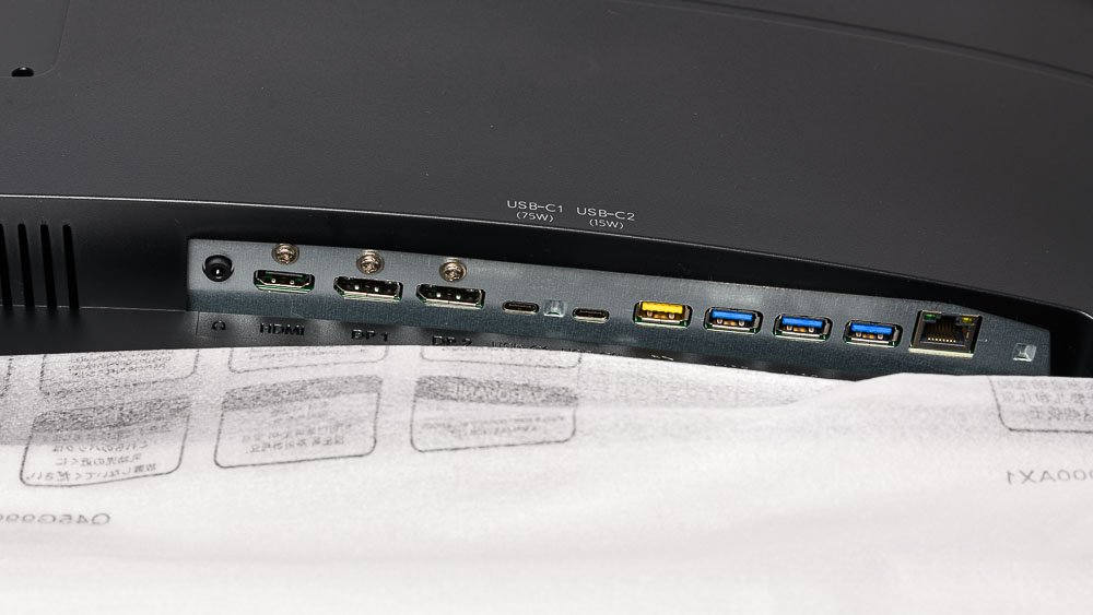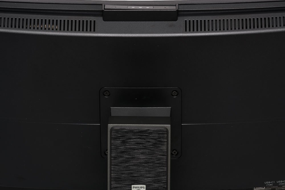 Auch bei den Anschlüssen ist der Philips 439P9H üppig ausgestattet: DisplayPort 1.4 (2 x), HDMI 2.0b (1 x), USB-C 3.2 Gen 1 (2 x) (DP ALT, Daten, Stromversorgung). Insgesamt wird die Stromversorgung mit bis zu 90 Watt unterstützt, allerdings zweigeteilt: USB-C1 unterstützt bis zu 75 Watt, USB-C2 bis zu 15 Watt.