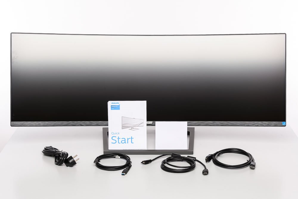 Trotz des eher günstigen Preises fällt der Lieferumfang des Philips 439P9H recht ordentlich aus. Alle wichtigen Kabel sind enthalten: DisplayPort, HDMI, USB-C und natürlich Strom. Beim USB-C-Kabel ist gleich ein Adapter angebracht, um das Gerät auch mit USB Typ A verbinden zu können.