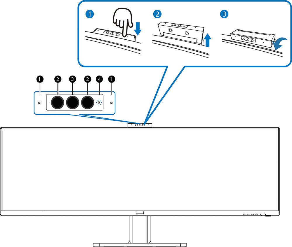 Im oberen Gehäuserahmen hat der Philips 439P9H auch eine HD-Webcam integriert. Auf Knopfdruck lässt sie sich ausklappen und genauso leicht wieder verstauen. Die Webcam kann dabei nicht nur für Videokonferenzen, sondern auch für eine passwortfreie Windows-Hello-Anmeldung genutzt werden.