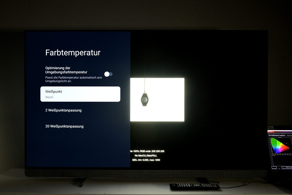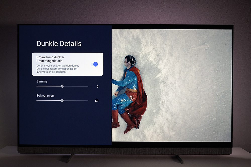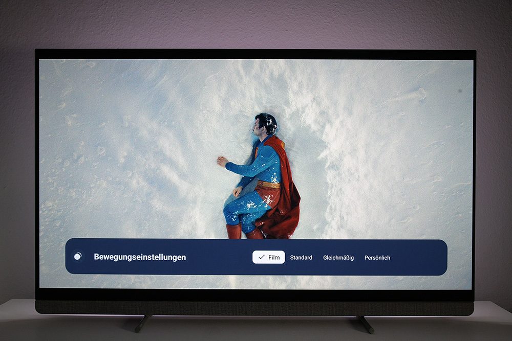 Ungeachtet der Energievorgaben der EU, schalten wir in den Bildmodus „Calman“, der sich schon beim Vorgängermodell bewährt hat. Gegenüber dem Filmmaker-Modus erreicht „Calman“ eine etwas höhere Lichtausbeute bei präzisen Farben. Der Umgebungslichtsensor, der das Bild am Abend abdunkelt, sollte ausgeschaltet werden, weil er die Helligkeit grundsätzlich zu stark dimmt. Fast alle „Verschlimmbesserer“ sind deaktiviert. Lediglich die Rauschfilter sollten noch deaktiviert werden, da es sich bei diesen Tools um typische Weichzeichner handelt.