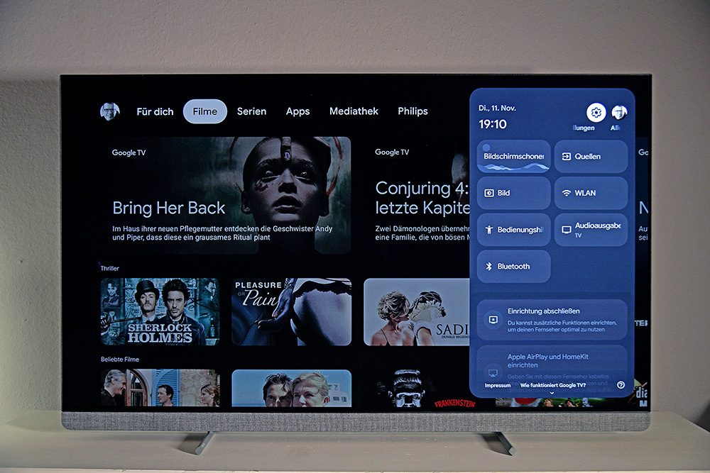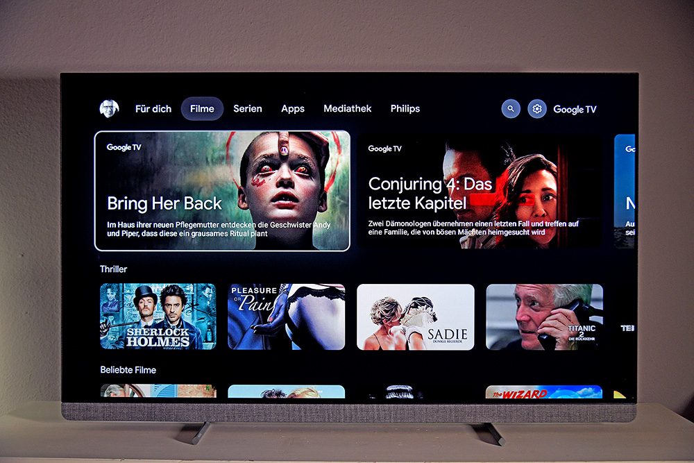 Im Home-Menü der Smart-Oberfläche von Google TV ist die Kopfzeile das Hauptmenü. Hier stehen die Reiter „Filme“, „Serien“, „Apps“, „Mediathek“ und „Philips“ zur Auswahl. Direkt daneben befindet sich der blaue Kasten mit „Alle Einstellungen“.