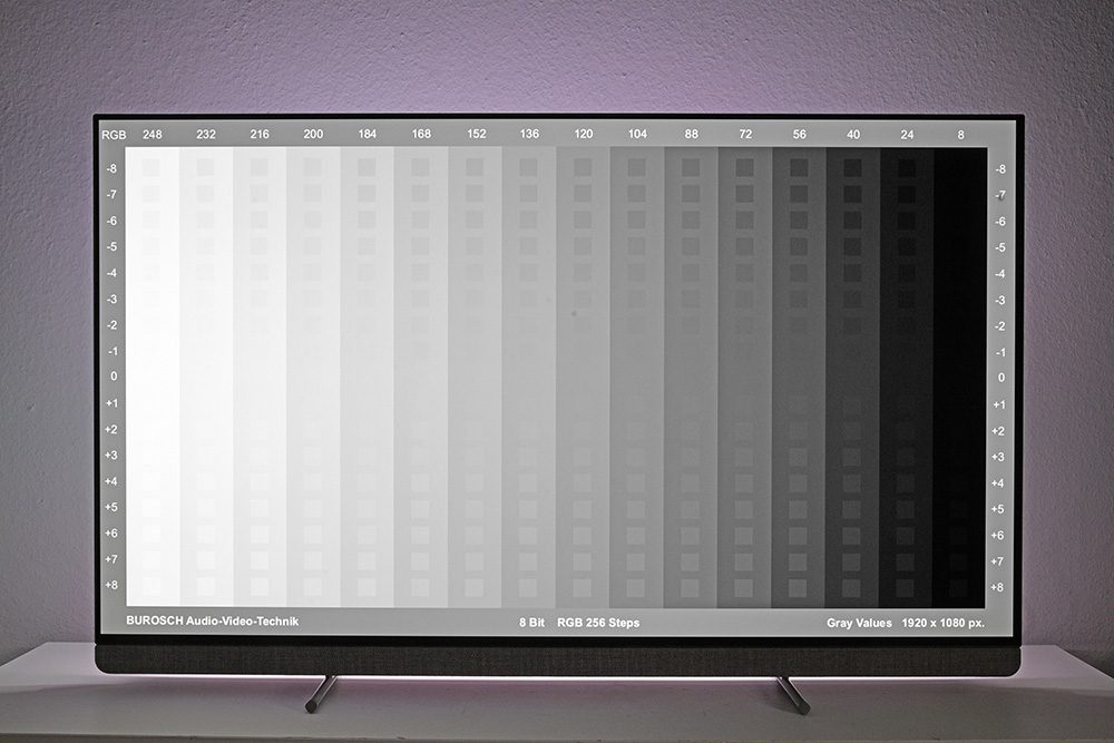 Alle 256 Graustufen eines 8 Bit starken jpg-Testbildes werden dargestellt. Der für HDTV-Filme relevante Wertebereich 16 (Schwarz) bis 235 (Weiß) ist auf unserem Testgerät vollständig zu sehen. Es laufen keine Inhalte im Schwarz zu, und es überstrahlt nichts ins Weiß. Hellere Abstufungen besitzen eine recht hohe Luminanz, was mit der Gamma-Messung korrespondiert.