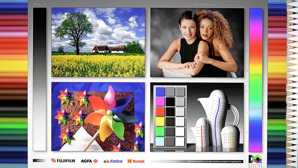 Keine nennenswerten Unterschiede verzeichnen wir in der Werkseinstellung zwischen dem Originalfoto und der Darstellung auf dem Philips 55OLED910/12. Nach der Kalibrierung sind Vorlage und dargestelltes Bild identisch. Die Hautfarben der Ladys sehen natürlich aus. Der blaue Himmel wird tadellos abgebildet, die Wolken heben sich davor plastisch ab. Selbst das Weiß unter den Stiften ist identisch. Kannen und Farbkarten sehen ebenfalls gleich aus.
