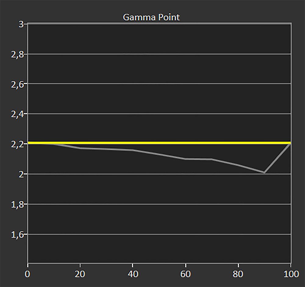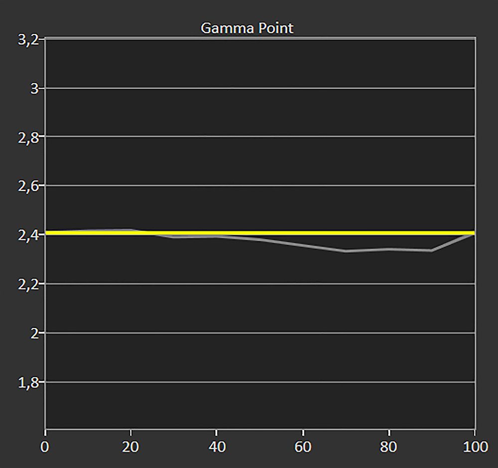 Das Gamma driftet ein wenig in Richtung 2,0, wodurch Inhalte etwas heller erscheinen, als sie es tatsächlich sind. Nach der Kalibrierung ist der Helligkeitsverlauf sehr viel besser. Das Gamma 2,4 schmiegt sich nahe an die Ziellinie. Dunkle und helle Szenen sind somit bestens durchgezeichnet. Nichts überstrahlt ins Weiß oder läuft im Schwarz zu. Im Übrigen erscheint das Bild nun knackiger.