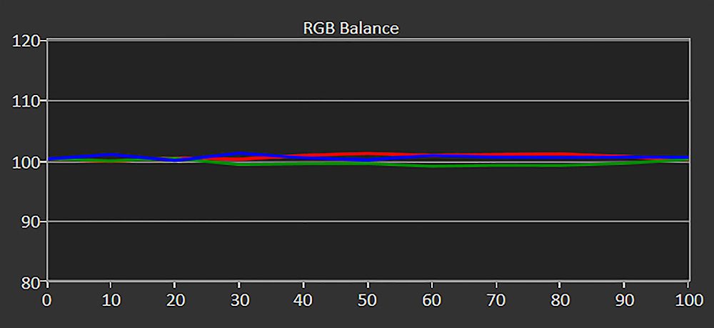Der Graustufenverlauf soll der 100 %-Linie folgen. In der Werkseinstellung des Bildmodus „Calman“ verlaufen Rot, Grün und Blau schon sehr gut um die Vorgabe von 100 % herum. Die Abweichungen sind so gering, dass sie bereits unterhalb der Wahrnehmungsschwelle liegen. Experten und engagierte Enthusiasten können das Ergebnis mit der Option „20 Weißpunktanpassung“ noch weiter trimmen.