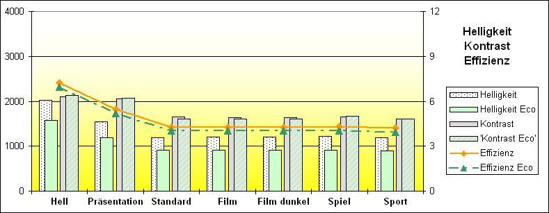 Im Eco-Modus sinkt die elektrische Leistung ebenso wie die Lichtausbeute auf etwa 80 Prozent ab, dadurch ändert sich an den Kontrast- und Effizienzwerten nicht viel gegenüber dem Normal-Modus. Auffällig ist, dass sich der Eco-Modus nur dann einstellen lässt, wenn vorher die Option Dynamic Black deaktiviert wird.