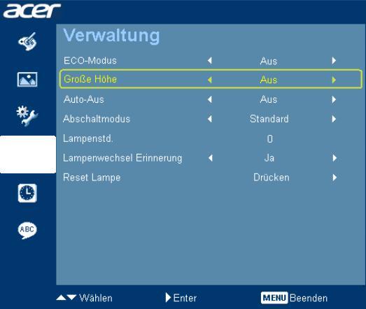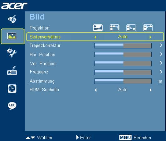 Das On-screen Display wird über die Menü-Taste am Projektor oder auf der Fernbedienung aufgerufen. Das Menü ist auf der linken Seite in sechs Bereiche mit jeweils bis zu 11 Optionen unterteilt. Vereinzelt sind auch Eingabefelder oder Scrollbalken anzutreffen.